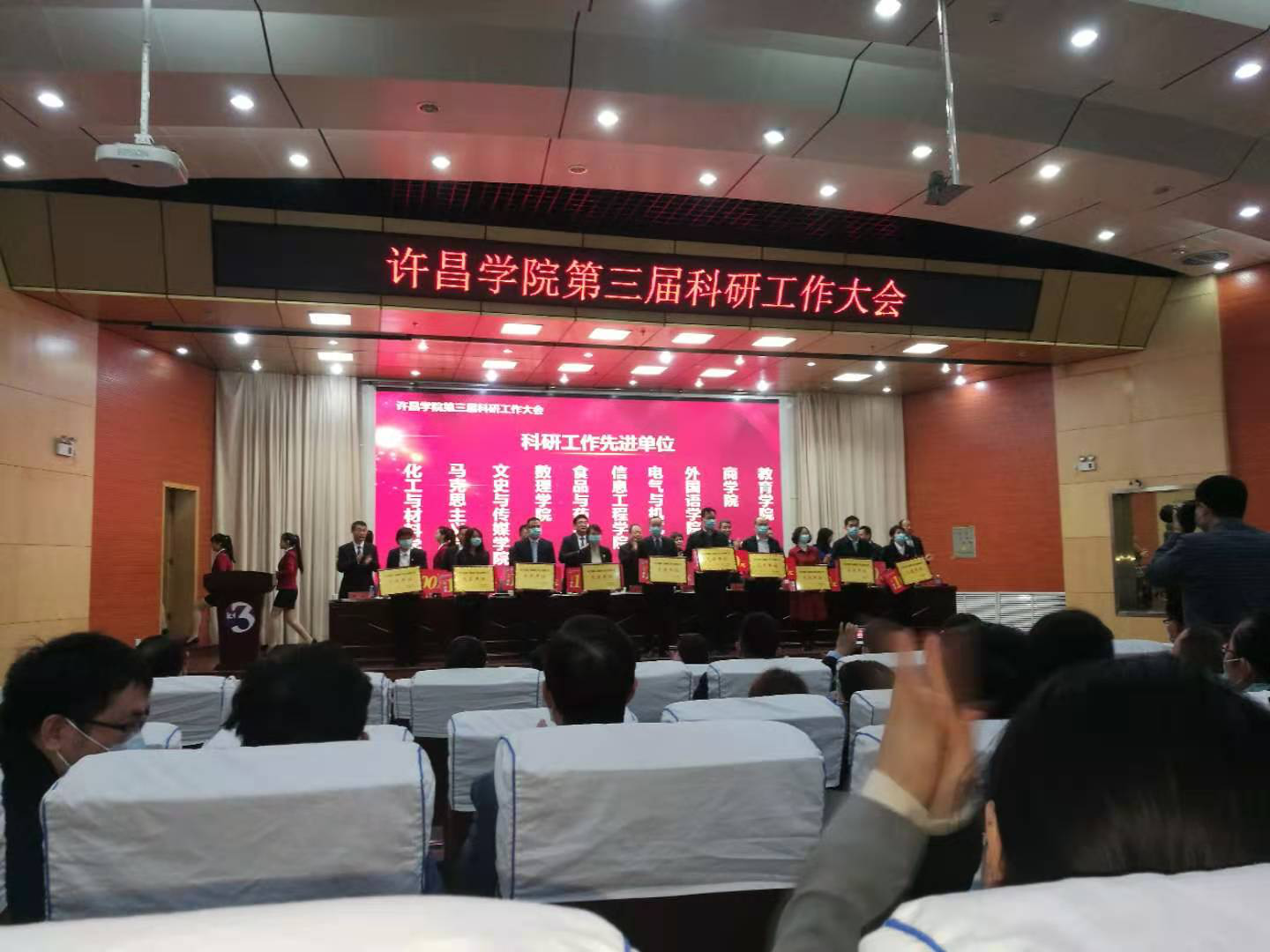 2020年11月6日,我校第三届科研工作大会在图书馆二楼学术报告厅召开。在大会上,我校党委副书记孙海宣读了《关于表彰科研工作先进单位、先进个人和科研管理工作先进个人的决定》,我院被评为许昌学院科研工作先进单位,我院姜荣刚和洪卫中两位老师被评为许昌学院科研工作先进个人。