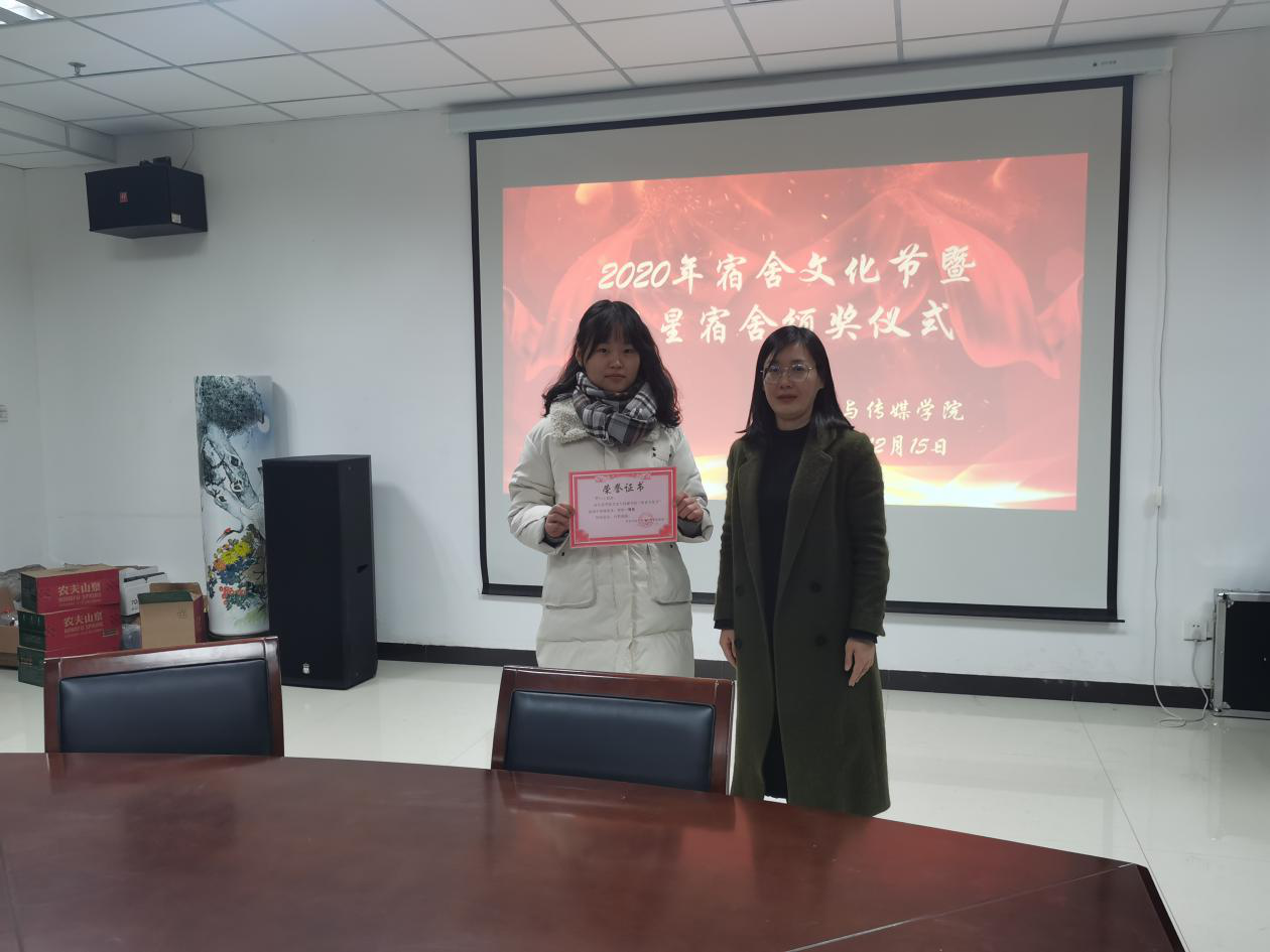 12月15日下午,我院在文综楼1417会议室举行2020年宿舍文化节暨五星宿舍颁奖仪式。文史与传媒学院党委副书记马丽娜、团委书记訾冉及我院各专业辅导员参加本次活动。