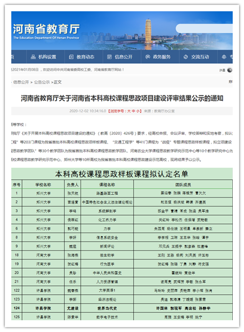 近日,河南省教育厅下发《河南省教育厅关于公布河南省本科高校课程思政项目建设名单的通知》,我院尤建设院长主讲的《世界当代史》课程被认定为河南省首批本科高校课程思政样板课程。