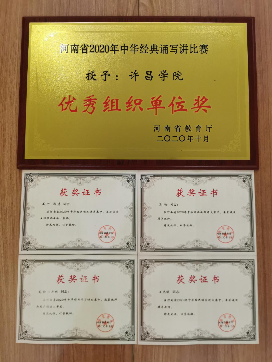 近日,河南省教育厅公布了河南省第二届中华经典诵写讲大赛“诵读中国”经典诵读大赛评选结果,我院选送的两个作品获得一等奖、二等奖,我校获得优秀组织奖。