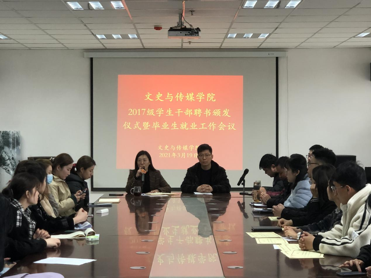 3月19日上午,我院在文综楼1417会议室召开2017级学生干部聘书颁发仪式暨毕业生就业工作会议。我院党委副书记马丽娜、院团委书记訾冉、院党建组织员张姗姗、院就业专干杨江浩、全体毕业班辅导员及2017级学生干部参加本次会议。会议由院团委书记訾冉主持。