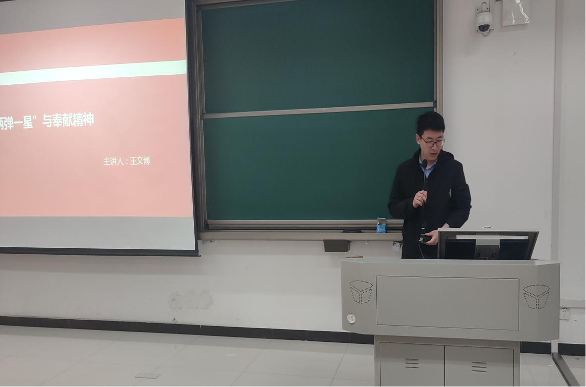 王文博老师介绍了钱学森、邓稼先等爱国科学家,为了国家安全默默地奉献自己,是我们值得学习的榜样。此外,王文博老师还带领入党积极分子们缅怀先烈,重温“两弹一星”精神——热爱祖国、无私奉献、自力更生、艰苦奋斗、勇于攀登。王文博老师指出,“两弹一星”精神激励和鼓舞了几代人,是中华民族的宝贵精神财富,同学们应继承两弹一星与奉献精神并发扬光大。