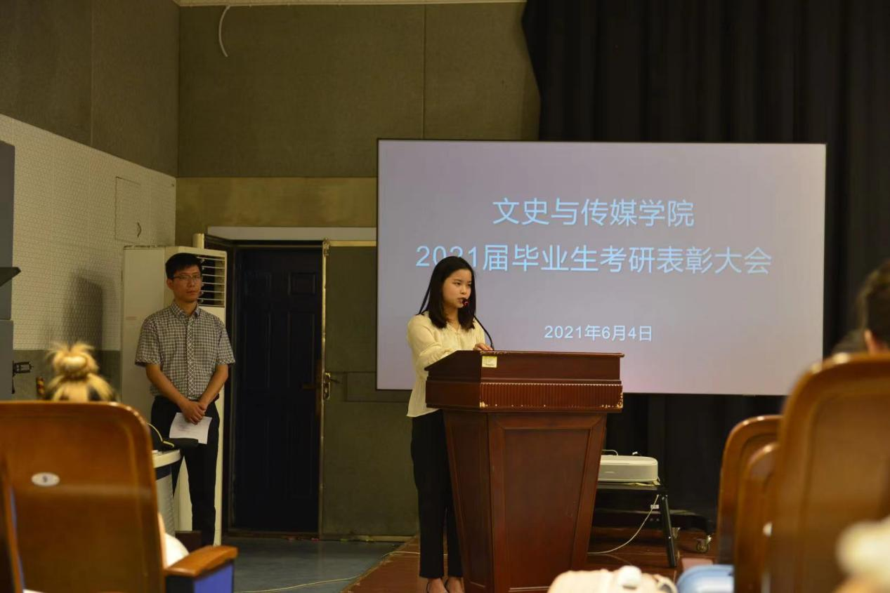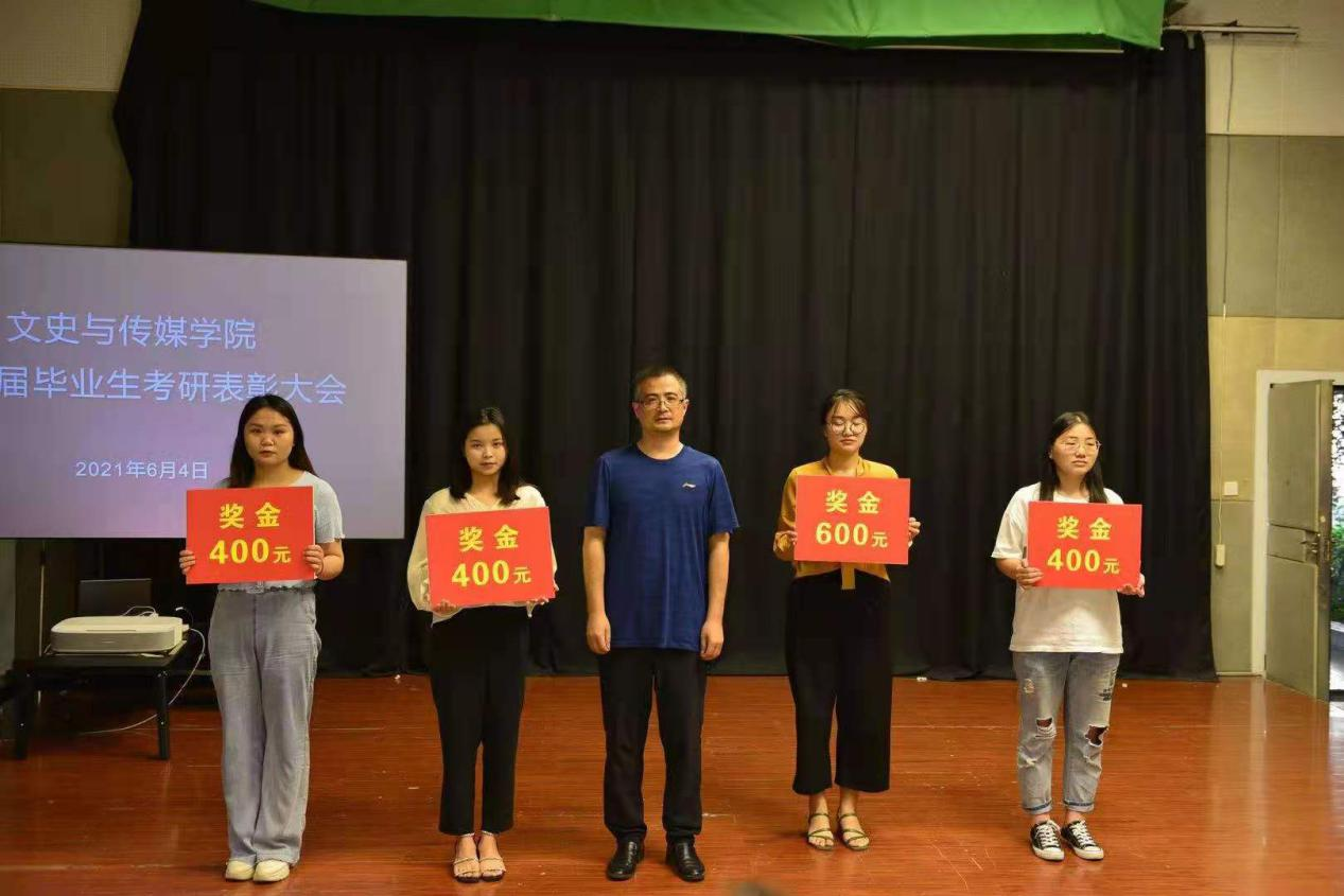 大会伊始,由我院副院长韩启振宣读2021届毕业生考研情况,我院党委副书记马丽娜宣读《文史与传媒学院关于对2021年考取硕士研究生学生和考研工作先进个人进行表彰奖励的决定》。随后,我院领导为2021年考取硕士研究生学生和考研工作先进个人颁发奖励并合影留念,给优秀辅导员老师颁发荣誉证书。