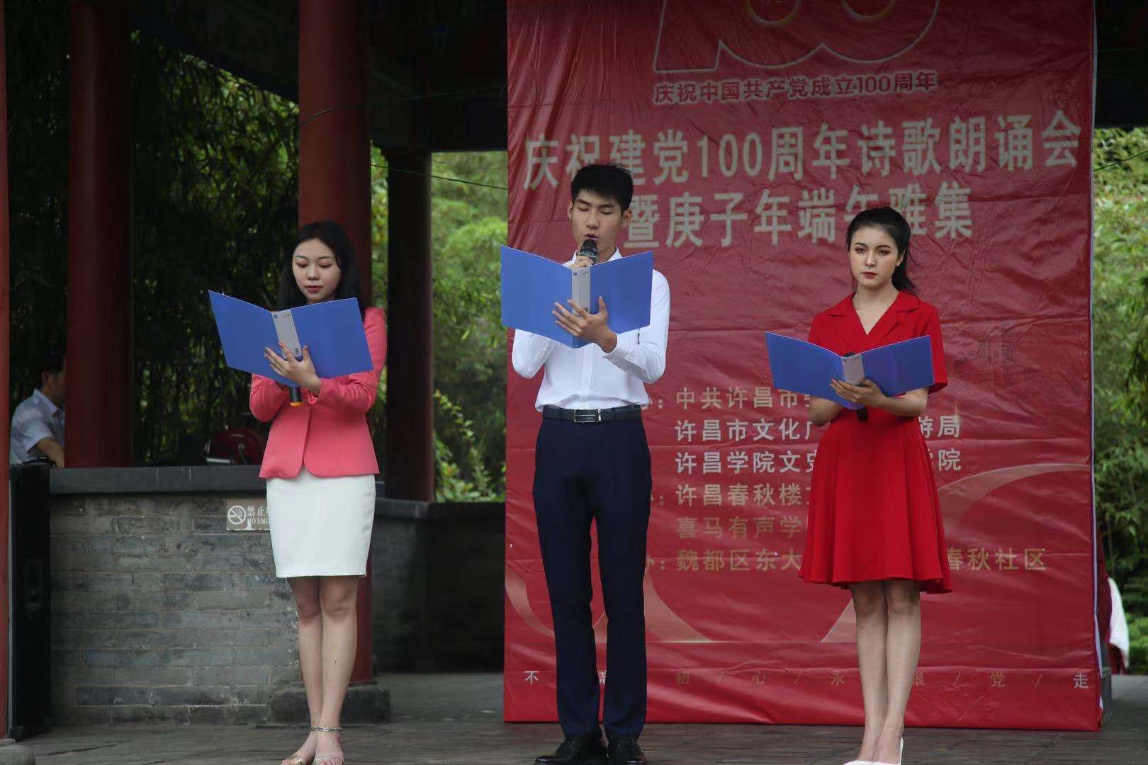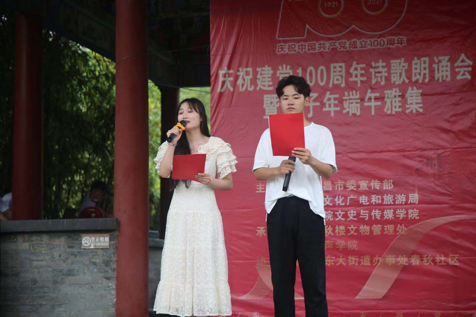 6月14日,由许昌学院文史与传媒学院、中共许昌市委宣传部、许昌市文化广电和旅游局共同主办,喜马有声学院、许昌春秋楼文物管理处共同承办的庆祝建党100周年诗歌朗诵会暨庚子年端午雅集在春秋楼景区问安亭举行。我院党委书记许涛和许昌春秋楼文物管理处负责领导共同出席雅集。
