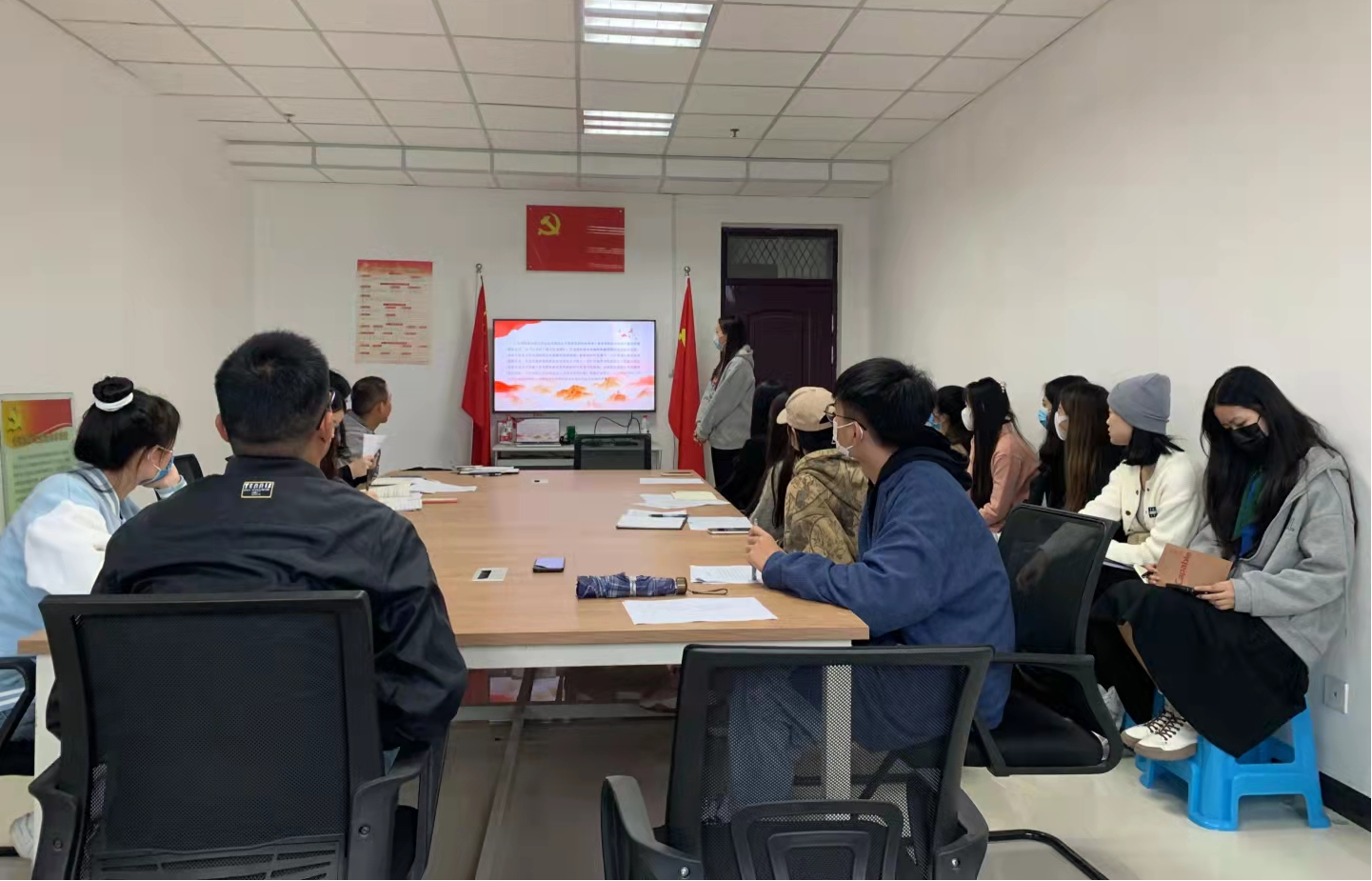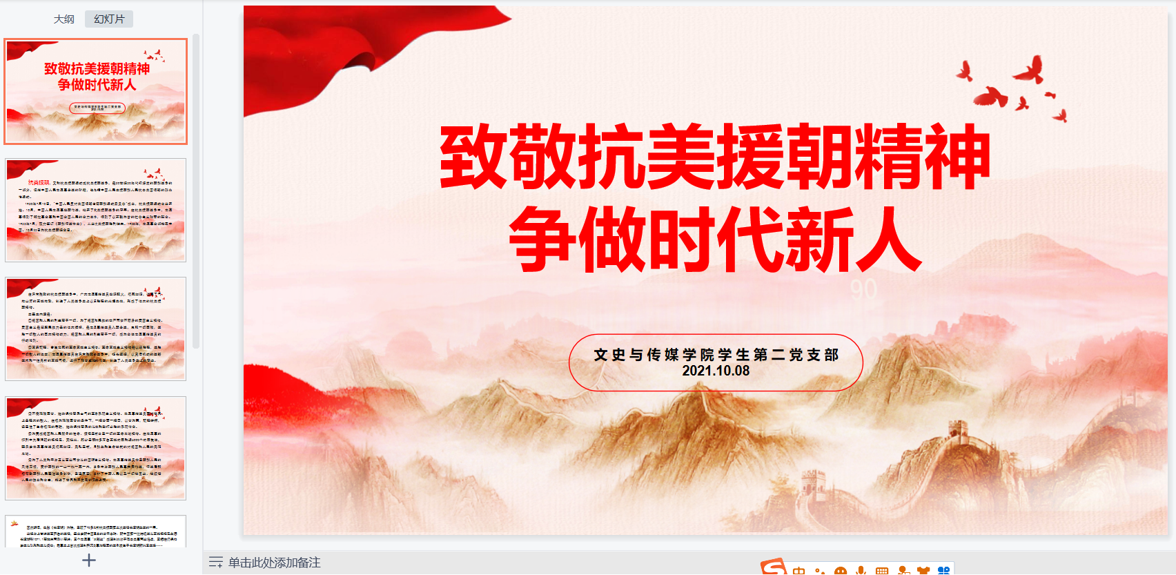 为扎实推进党史学习教育,缅怀革命先烈,10月8日下午,我院学生第二党支部在文综楼1509党员活动室开展“致敬抗美援朝精神,争做时代新人”主题党日活动。本次党日活动由学生第二党支部书记万光明老师主持召开,学生第二党支部全体党员和入党积极分子到场参会。