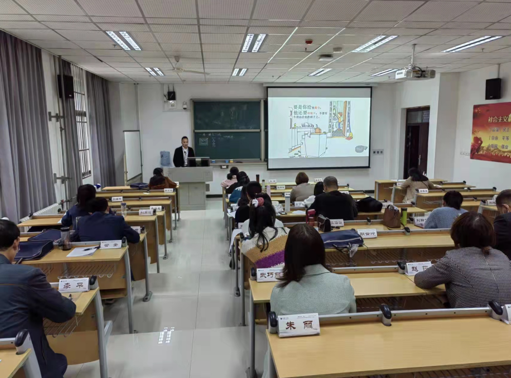刘伟峰老师以“一圈一圈往下绕”为题讲述“环绕式”教学方法。该教学方法就像俄罗斯套娃,层层递进,由浅入深,逐渐突出主题,同时刘老师举出童谣《房子里有箱子》、诗歌《需要什么》、《我底下有什么》和《要是你给老鼠吃饼干》的故事来具体讲述该教学方法。在讲课过程中,刘伟峰老师字正腔圆,极具播音气质,用富有磁性和感染力的声音将内容娓娓道来,引人入胜。其中《要是你给老鼠吃饼干》的故事图文并茂,不仅生动形象,更能增强同学们的阅读兴趣。
