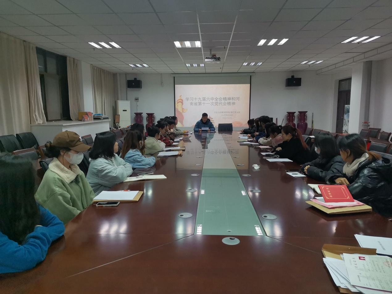 11月26日下午5时,文史与传媒学院学生第三党支部开展“学习贯彻党的十九届六中全会和河南省第十一次党代会精神”主题党日活动和支部书记讲党课活动,活动由支部书记訾冉主持,支部全体党员和预备党员参加此次活动。