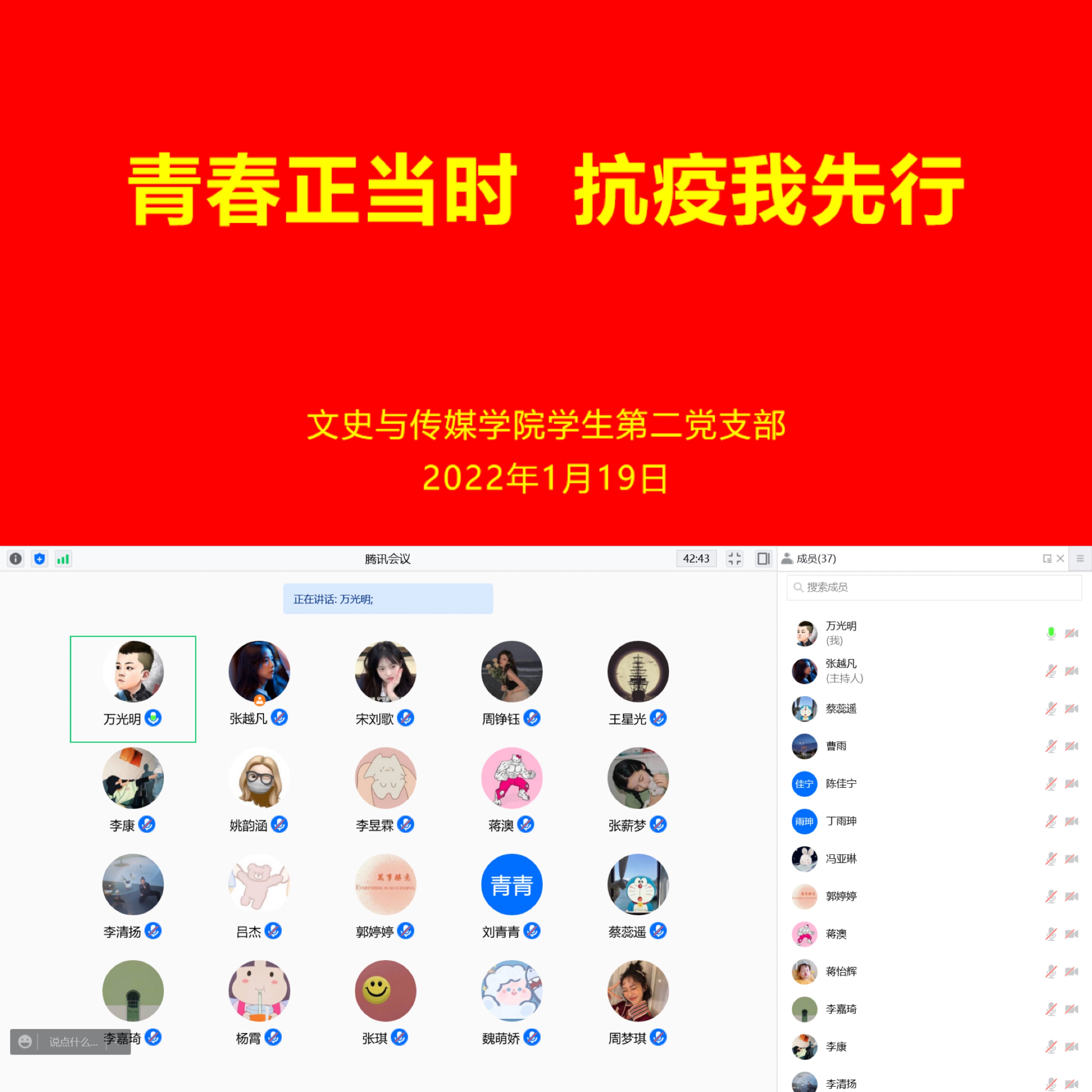 1月19日,文史与传媒学院学生第二党支部召开“青春正当时,抗疫我先行”线上主题党日活动,本次会议由党支部书记万光明老师主持,全体党员参加学习。