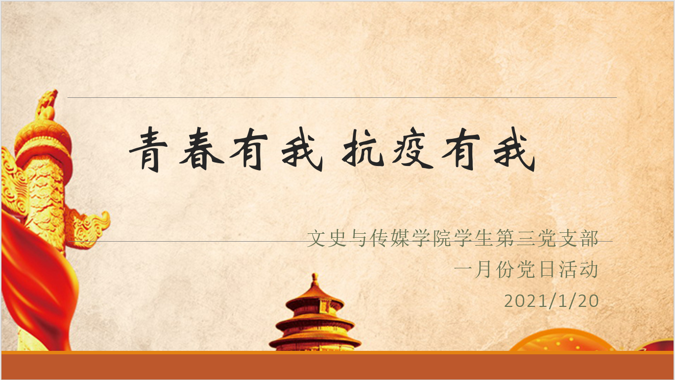 1月20日,文史与传媒学生第三党支部开展“青春有我,抗疫有我”线上主题党日活动,会议由党支部书记訾冉主持,支部全体党员参加此次活动。