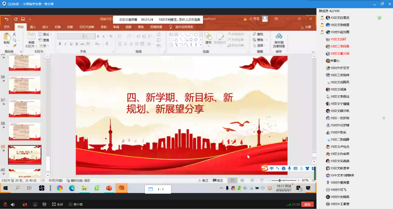 2022年2月27日,我院学生第一党支部召开了线上“新学期、新目标、新规划、新展望”线上主题党日活动。