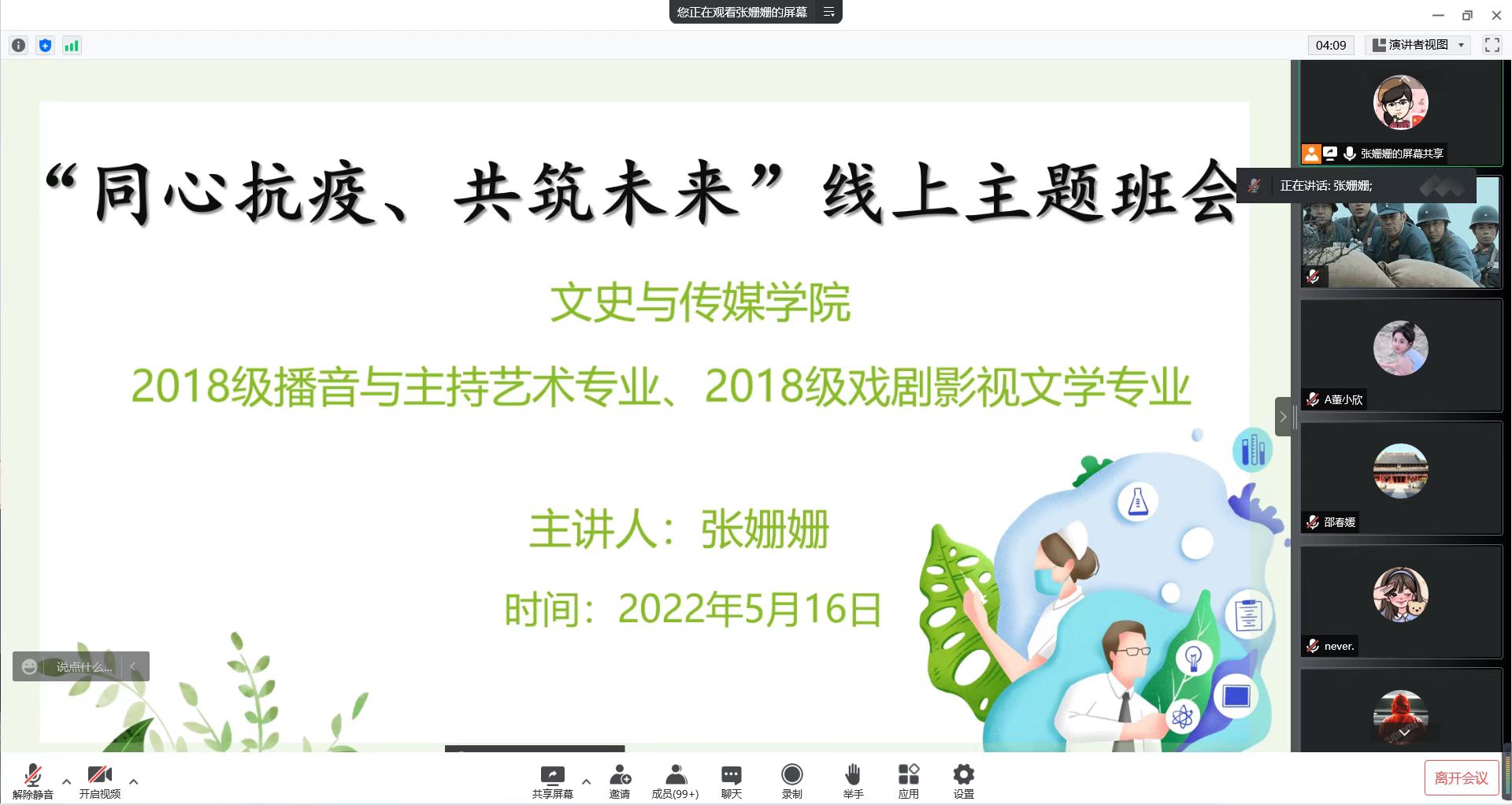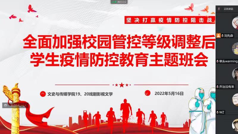 5月16日,我院组织全体学生通过线上的形式开展了校园管控期间主题班会和专题党课,主题班会由全体辅导员组织开展,专题党课由我院党委书记许涛、党委副书记马丽娜讲授,面向学生上了一堂生动的战疫“云端”思政课。