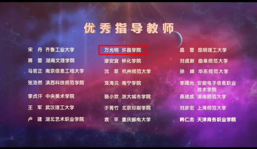第14届全国大学生广告艺术大赛由中国高等教育学会广告教育专业委员会指导、全国大学生广告艺术大赛组委会、中国传媒大学、大广赛文化传播(北京)有限公司共同举办,近日该赛事成果展示云盛典在北京成功举办,许昌学院文史与传媒学院荣获全国一等奖1项、三等奖2项、优秀奖8项;文史与传媒学院播音与主持艺术系教师万光明荣获全国“优秀指导教师”奖。