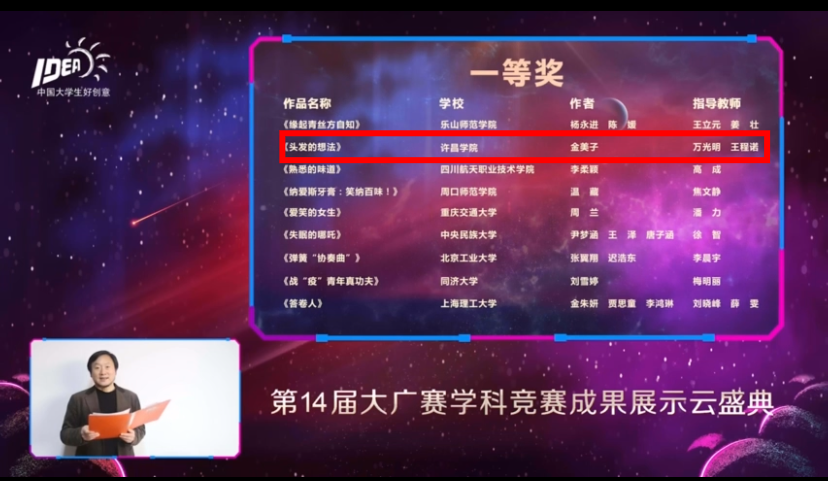本次大广赛吸引了来自全国29个赛区1869所高校174万大学生踊跃参赛,创意作品高达74万余组。经过学校初评、赛区评选、命题方初筛、全国组委会评委终审,最后6587组作品获得全国奖,其中全国一等奖的获奖率仅为0.02%。文史与传媒学院播音与主持艺术专业学生金美子创作的广播广告作品《头发的想法》荣获全国一等奖。此外,在河南赛区比赛中,我院播音与主持艺术、戏剧与影视学专业学生荣获省级一等奖2项、二等奖11项、三等奖10项。我院万光明、高晗、王文博老师荣获河南赛区“优秀指导教师”奖。(审核:许涛)