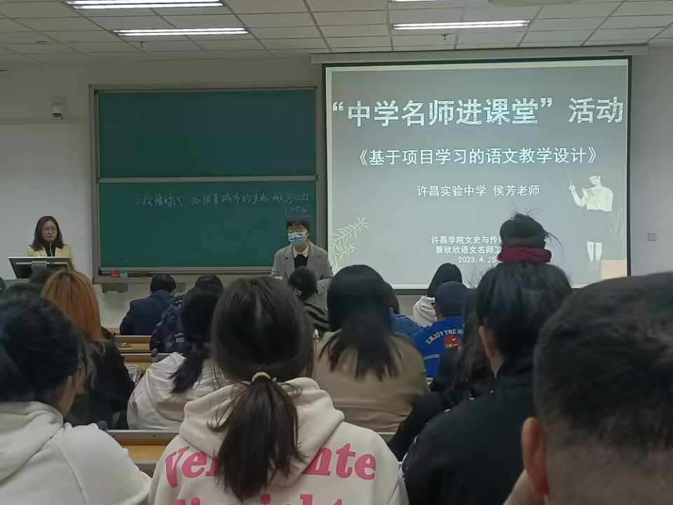 2023年4月22日晚上,我院在E318教室举办了“中学名师进课堂”活动。本次活动邀请许昌实验中学语文名师侯芳老师来校介绍项目式教学的开展情况。学院副院长韩启振、中文系副主任王晓敏和2020级中文专业师范生共130余人到场观摩学习。