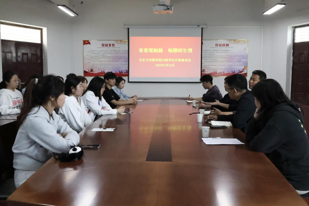 为进一步畅通师生沟通渠道,深入了解2024级学生在书院学习生活的实际需求,3月26日中午,文史与传媒学院于兴华路校区博雅书院201会议室召开师生座谈会。学院党委书记李立夏、党委副书记訾冉、学工办主任赵苏理、党建组织员王程诺、2024级辅导员鲁自轩及学生代表共同参与座谈。