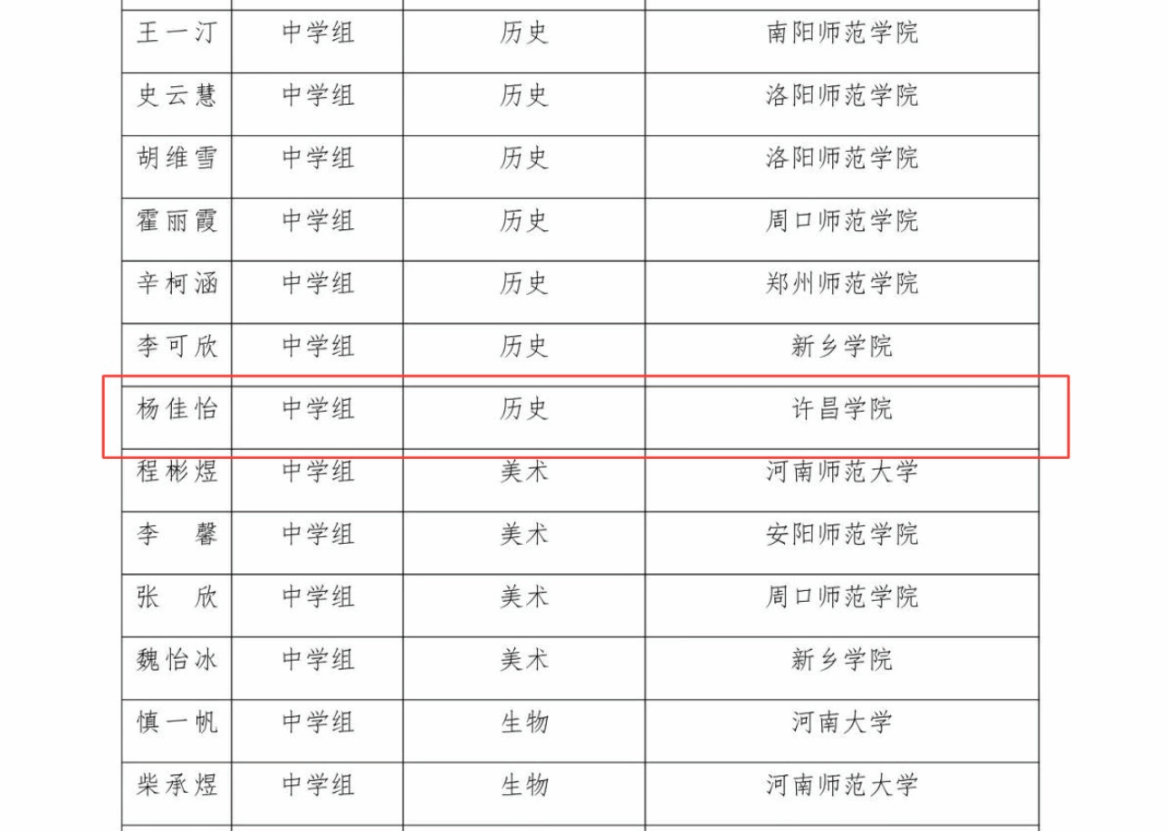 近日,河南省教育厅正式公示了第二十三届高等学校师范类专业毕业生教学技能比赛结果。我院参赛学子凭借扎实的专业功底、精湛的教学技能和出色的现场表现,在激烈的竞争中脱颖而出,荣获佳绩。其中,历史学专业杨佳怡同学荣获中学历史组二等奖,汉语言文学专业朱孟媛同学荣获中学语文组三等奖。这一成绩充分彰显了我院师范专业人才培养的优良质量与学生卓越的综合素养。