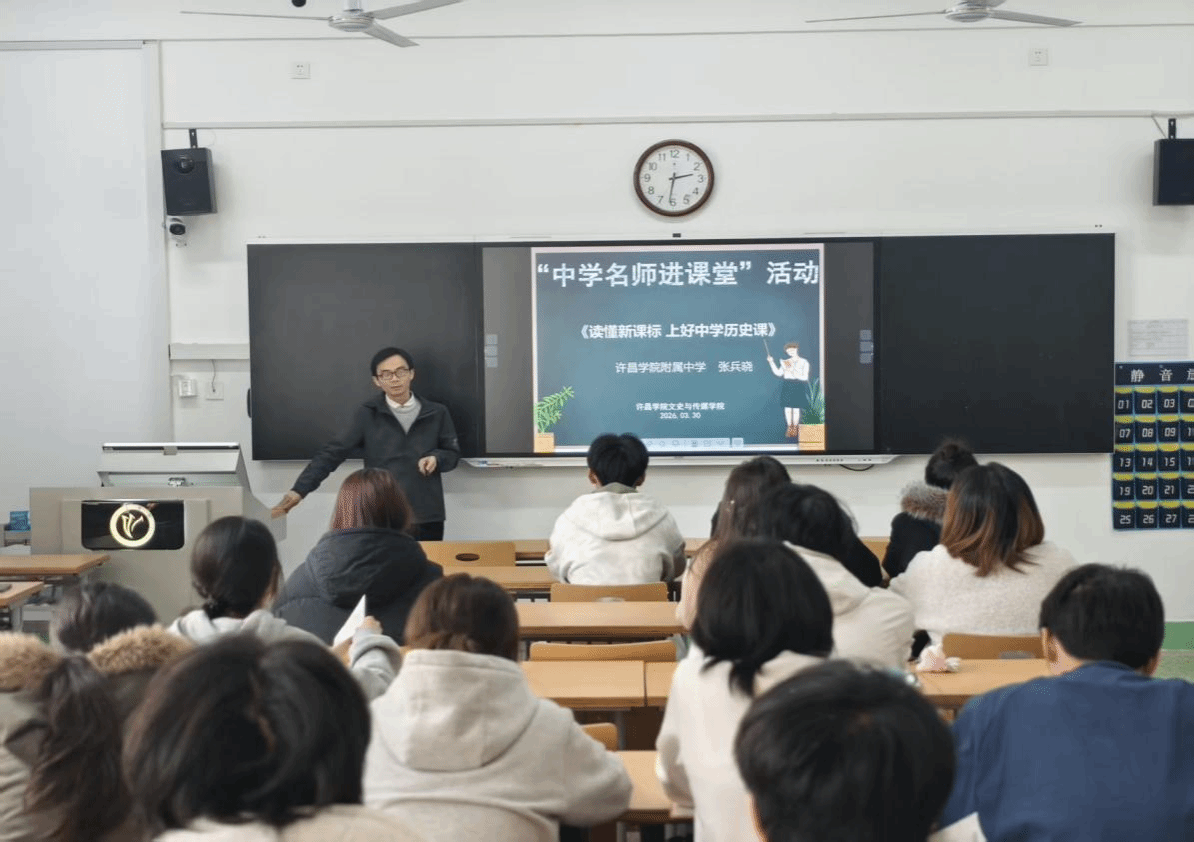 3月30日下午,文史与传媒学院历史系在B2-203教室举办“中学名师进课堂”专题活动。本次活动以“读懂新课标 上好中学历史课”为主题,特邀许昌学院附属中学文综组组长、许昌市东城区名师张兵晓老师担任主讲。我院历史系教师孙静华、袁旭阳及24级历史学专业学生参加活动。