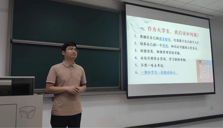 2023年5月18日晚上,我院在文科楼418教室举行第二期中学名师进课堂活动。本期活动邀请我院2016届校友、许昌市第一中学年级政教主任朱宏伟老师分享师德建设和德育工作经验,他的讲座题目是《新时期师范生师德教育和德育工作经验交流》。2021级全体中文师范生参加了此次分享活动。