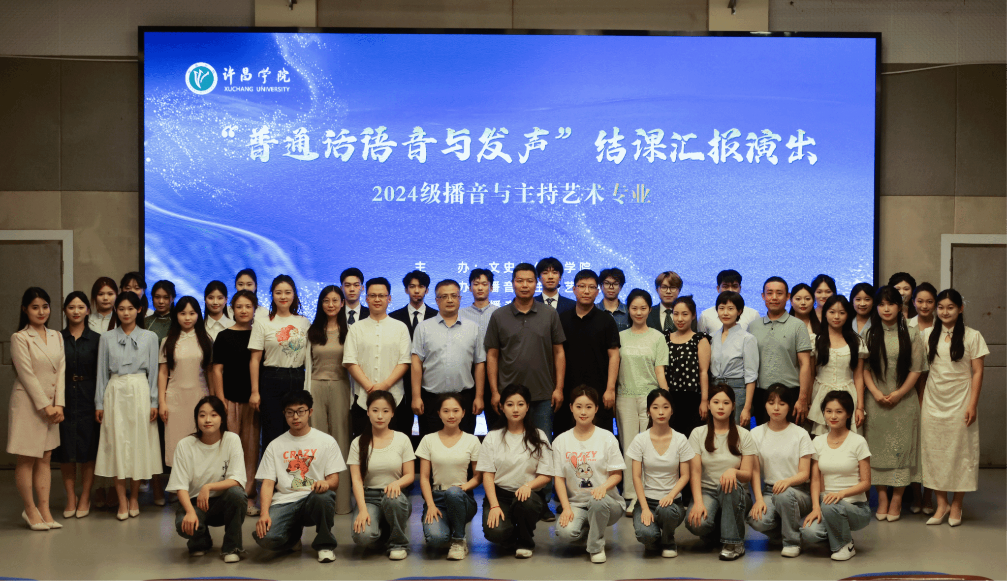 2025年6月12日下午,我院2024级播音与主持艺术专业“普通话语音与发声”结课汇报演出在B合七演播厅成功举行。我院党委书记李立夏、院长尤建设、党委副书记訾冉、团委书记张姗姗、组织员王程诺以及部分播音与主持艺术专业师生观看了演出。