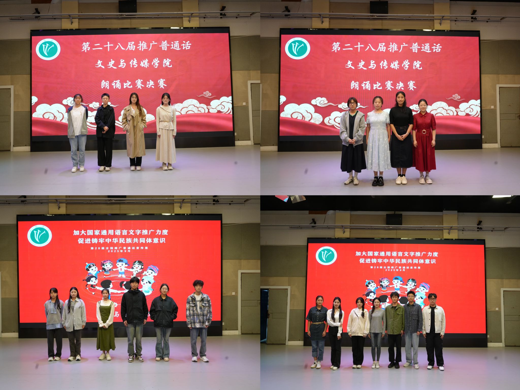 2025年9月19日下午,我院于B合7演播厅顺利举行第28届推广普通话宣传周朗诵比赛。本届大赛以“加大国家通用语言文字推广力度,促进铸牢中华民族共同体意识”为主题,积极响应国家语言文字推广政策,深入推进普通话在校园内的规范使用与广泛传播。赛事涵盖赛前组织宣传、初赛选拔和决赛评选三个环节。