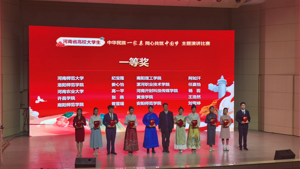 2024年12月4日,河南省委教育工委、省教育厅举办的“中华民族一家亲 同心共筑中国梦”主题演讲比赛在河南师范大学举行。我院播音与主持艺术专业学生张燕荣获演讲比赛一等奖,韩诗瑾获得优秀指导老师。校党委统战部部长王彦和我院党委书记李立夏出席闭幕式和颁奖仪式。