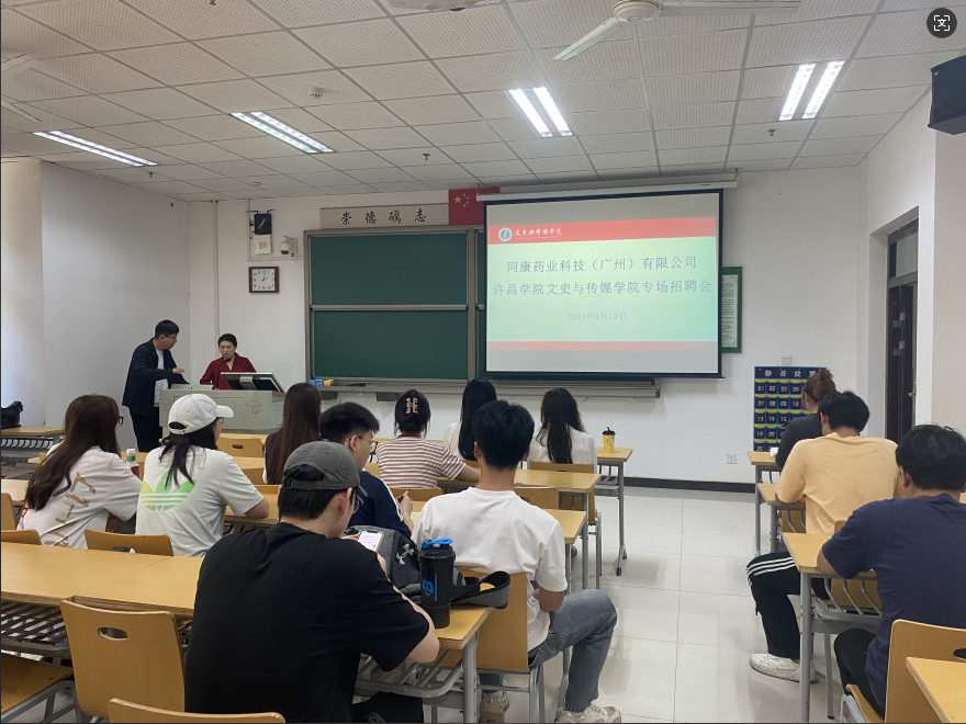 2025年4月18日下午,我院在文综楼108教室成功举办广州同康药业科技有限公司专场招聘宣讲会。我院党委副书记訾冉、学工办主任赵苏理、就业专干杨江浩、毕业班辅导员和2025届部分毕业生参加了本次专场招聘宣讲会。